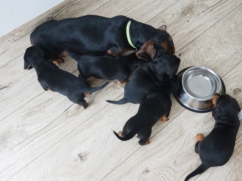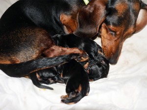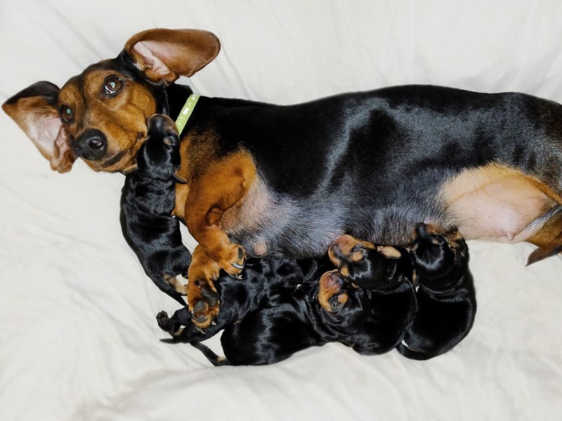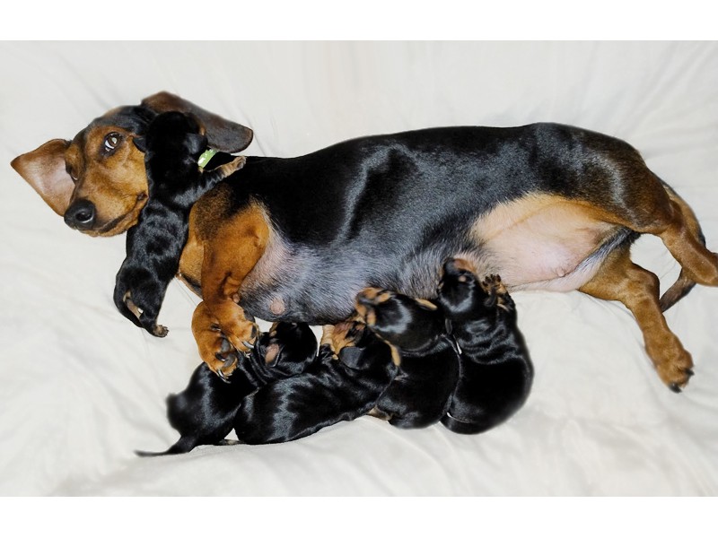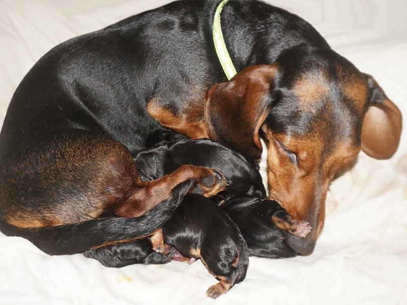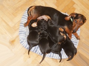 Mama IVA urodziła pięć jamniczków bez żadnych problemów, siłami natury. (Trzeci miot jamniczki.)