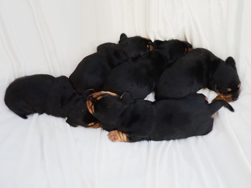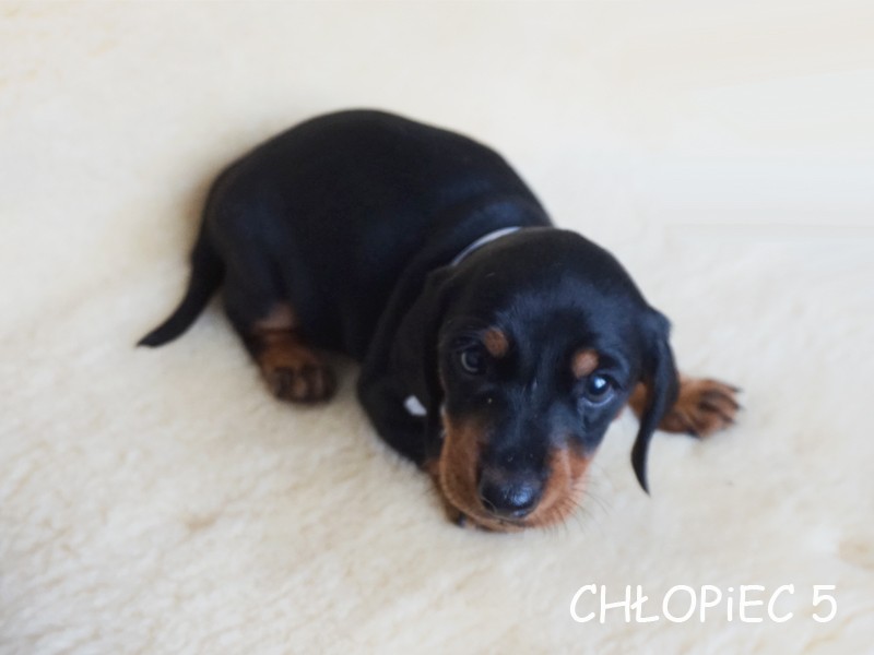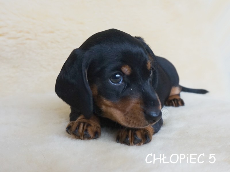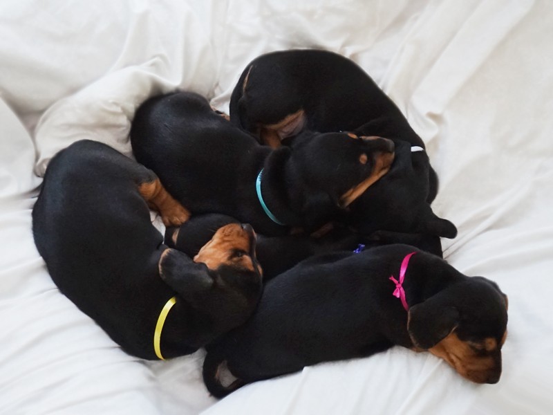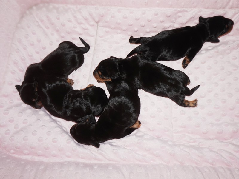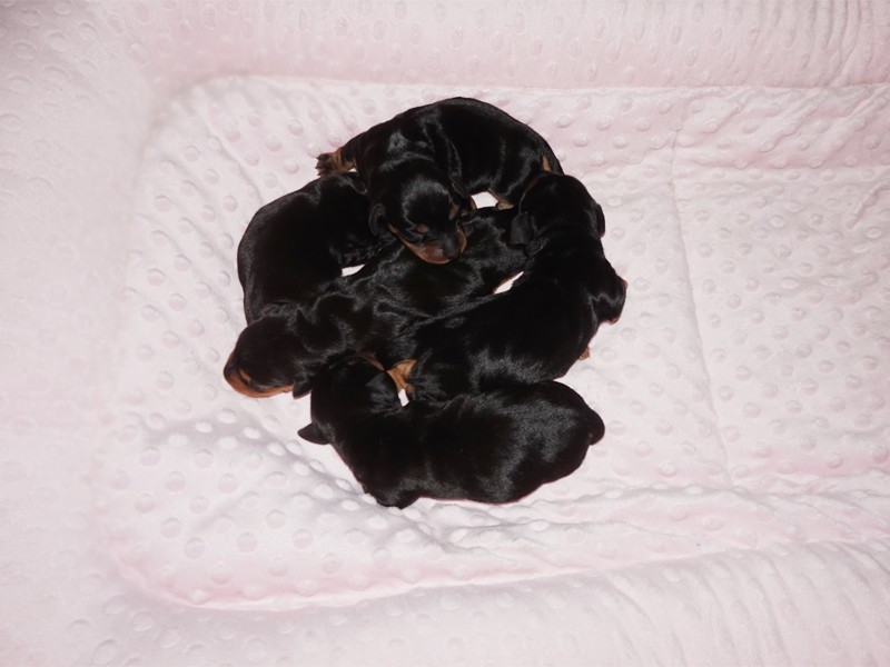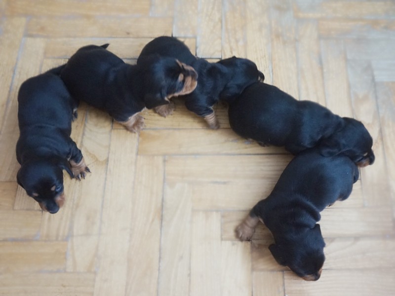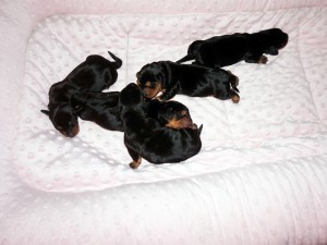Wszystkie jamniczki są czarne podpalane: 3 samce i 2 suczki. :)