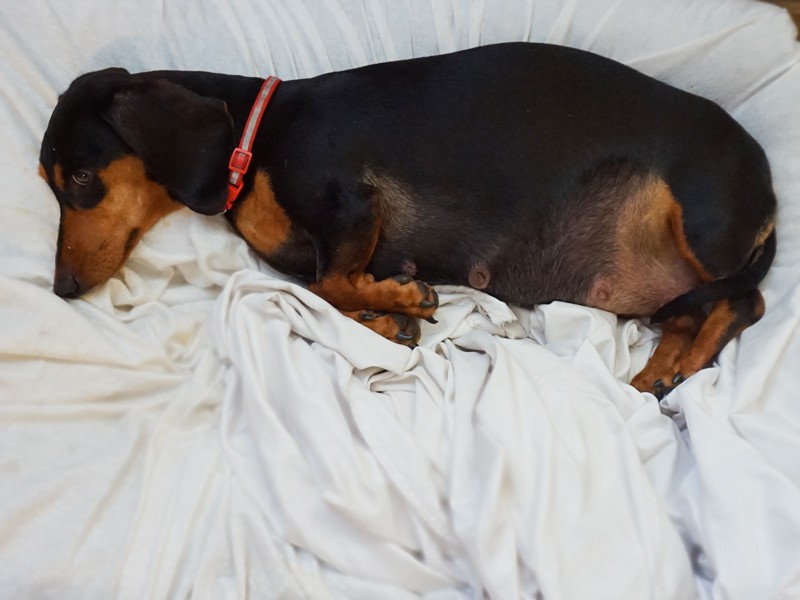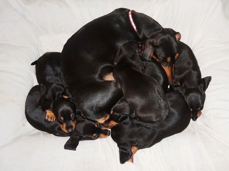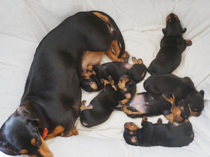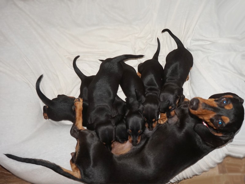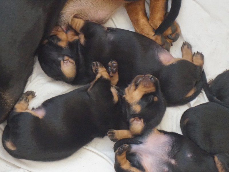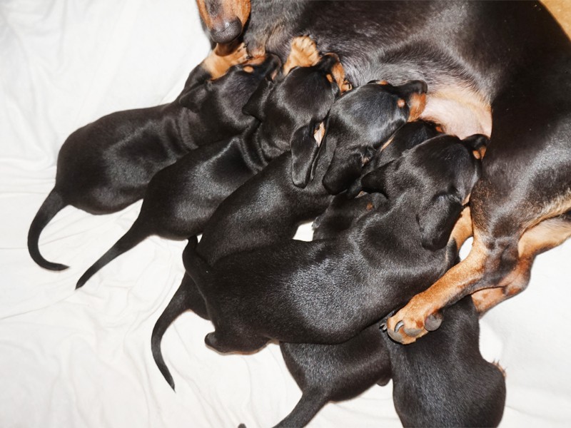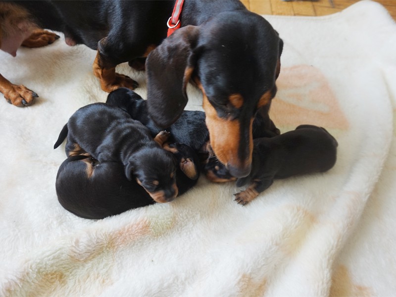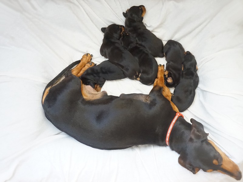 Mama JOSEPHINE urodziła sześć jamniczków bez żadnych problemów, siłami natury. (Trzeci miot jamniczki.)