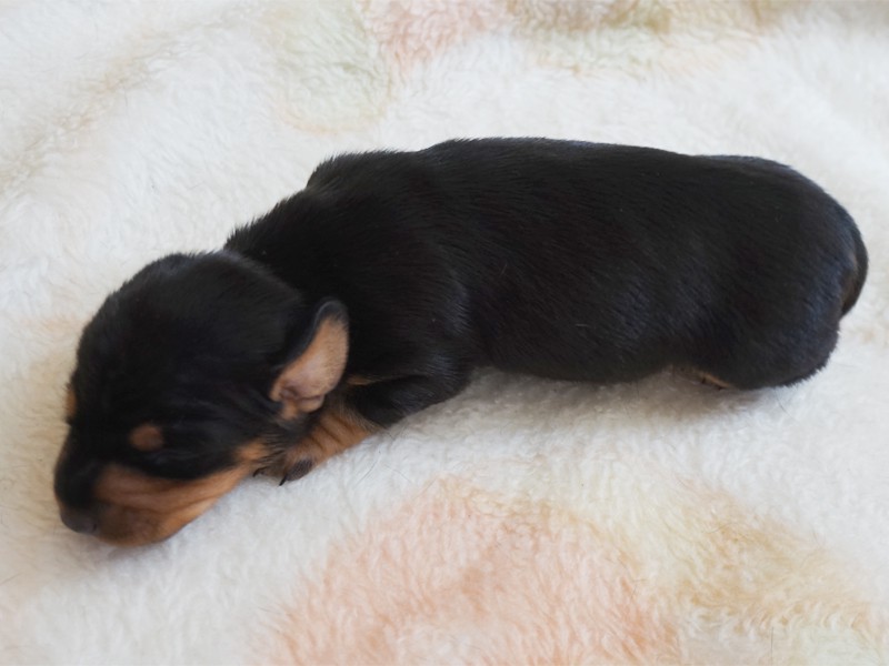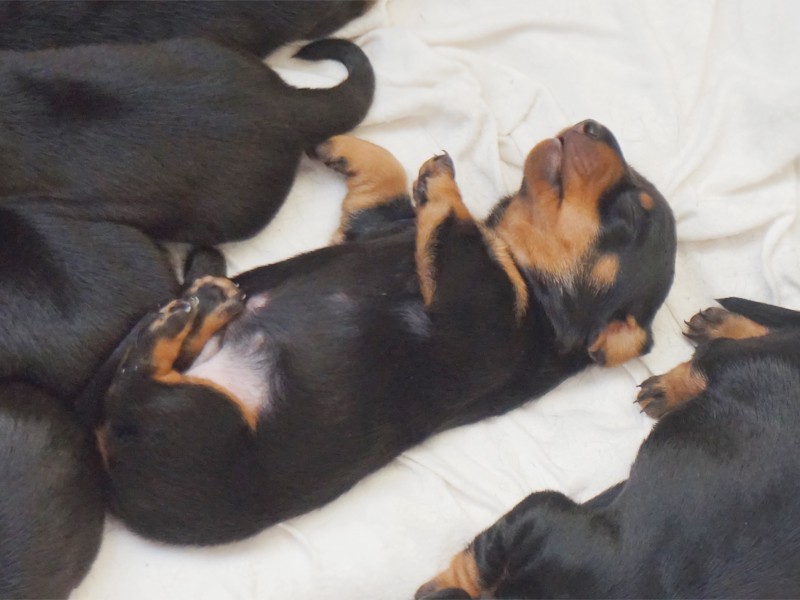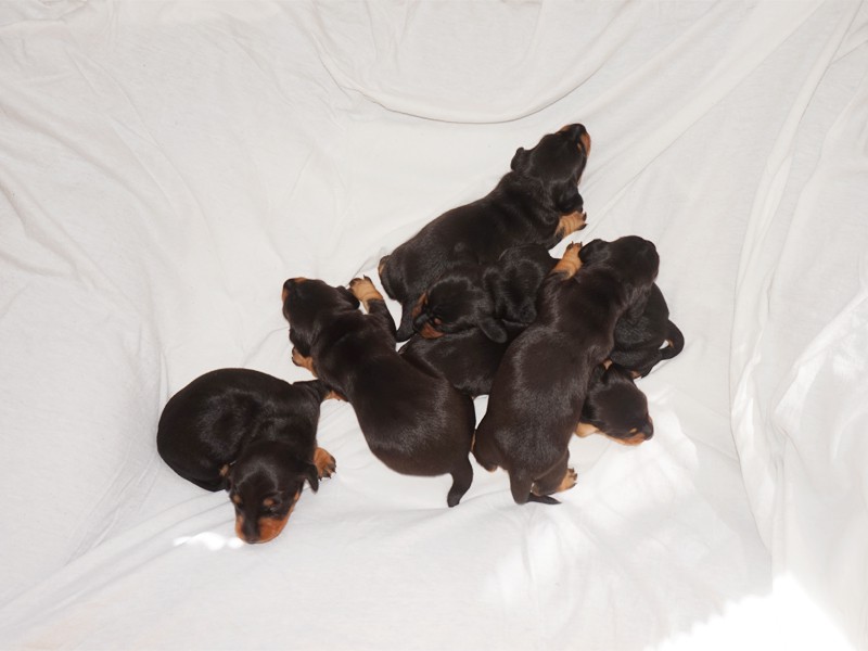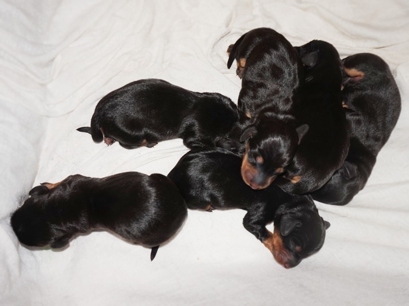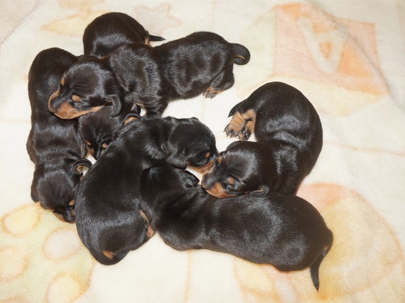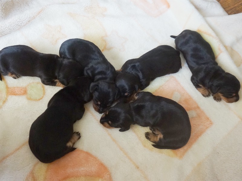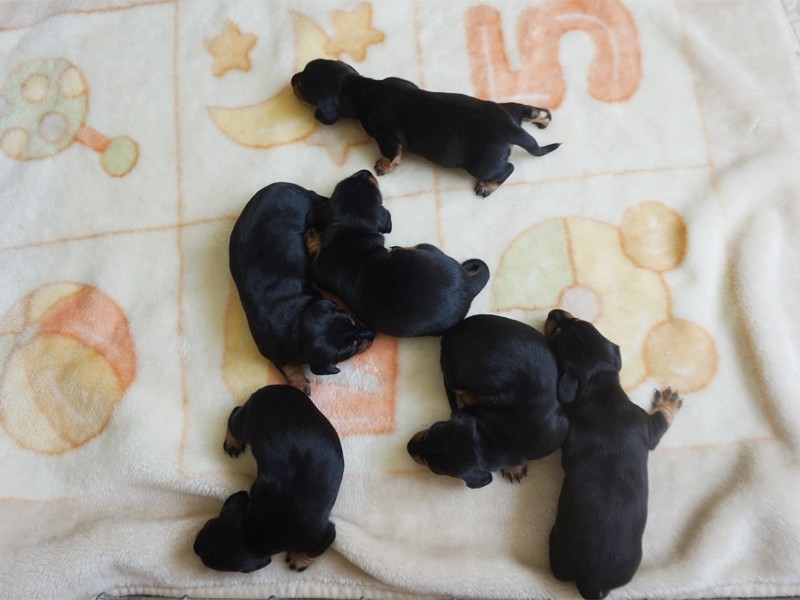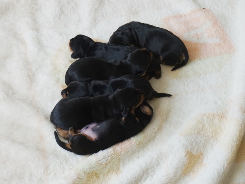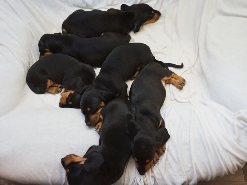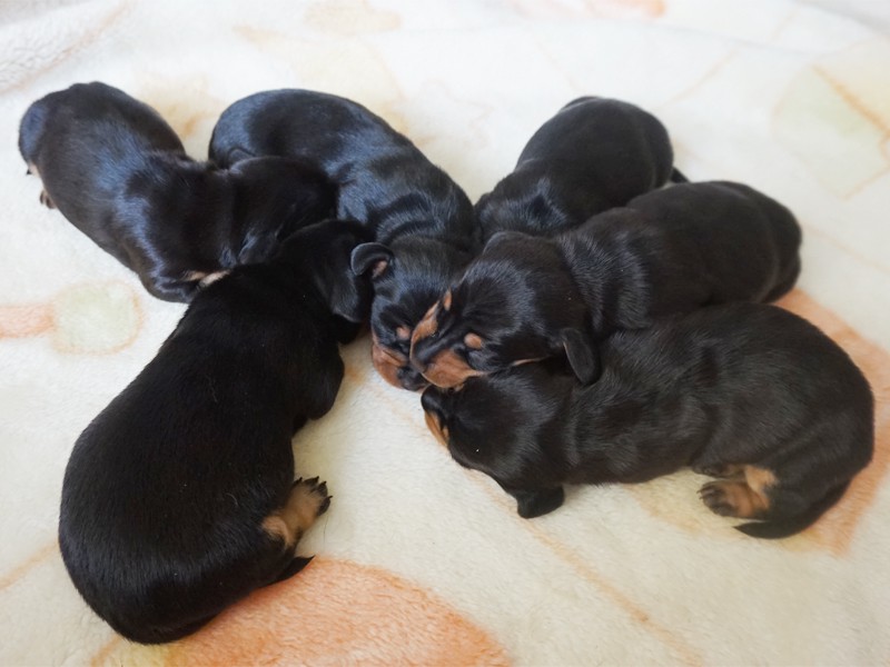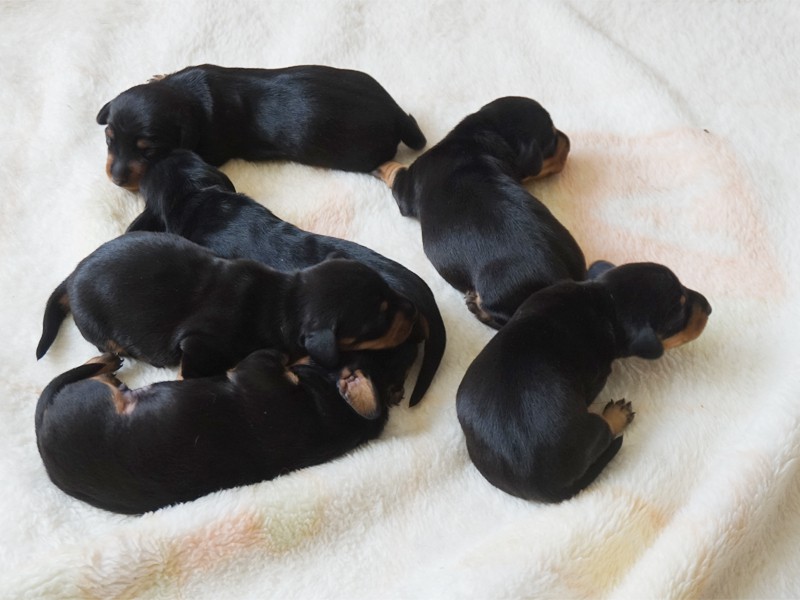 Jamniki, krótkowłose standardowe (sądząc po wielkości rokują, że będą jamnikami miniaturowymi): sześć czarnych podpalanych.