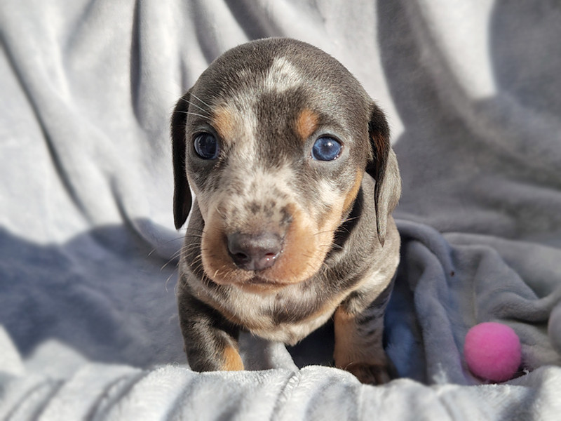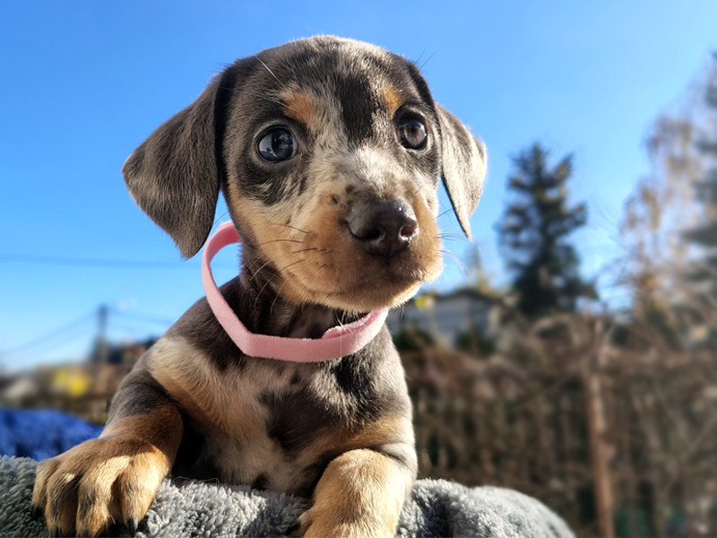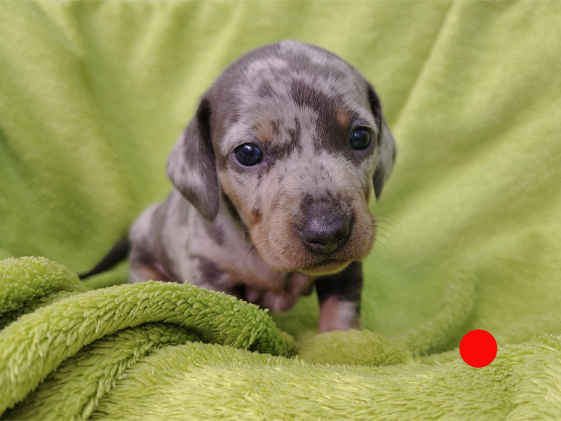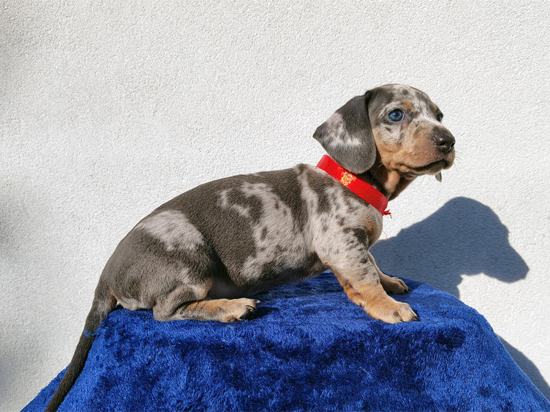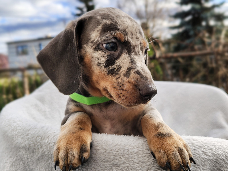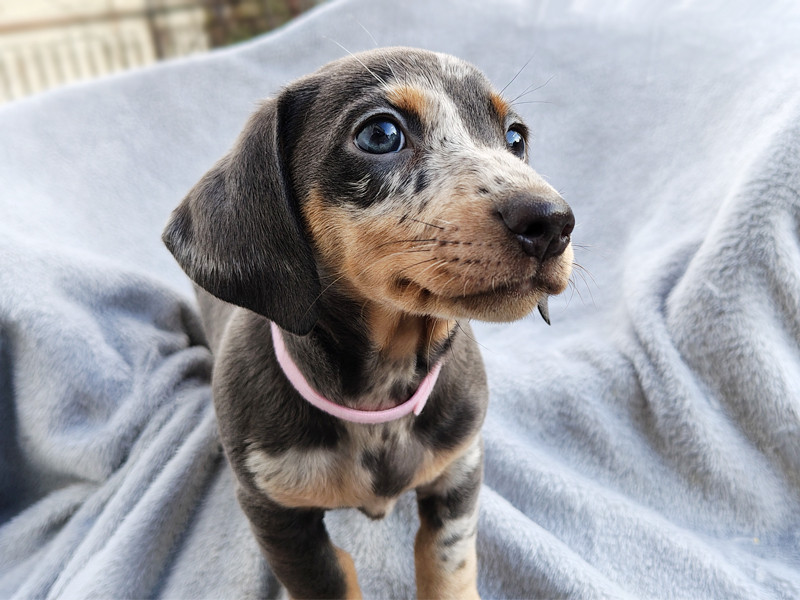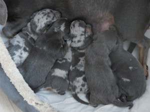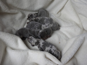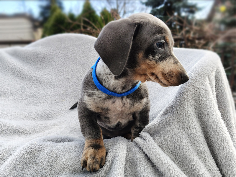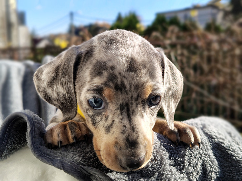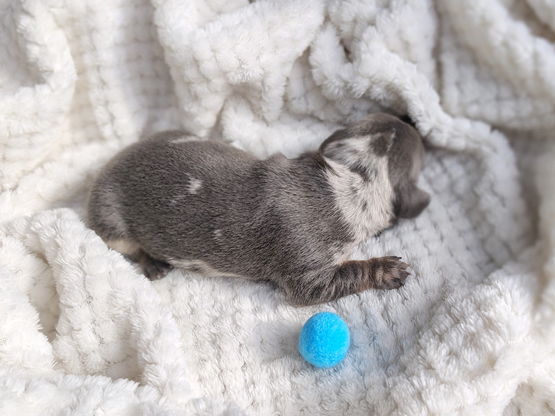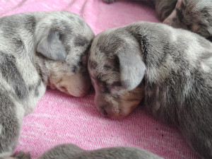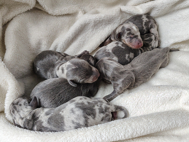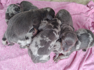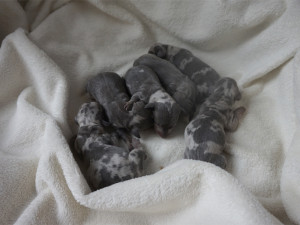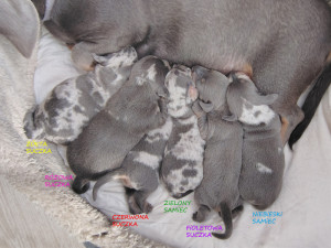 (Umaszczenie Blue merle, szczenięta mają plamki niebiesko-niebieskie (czyli potocznie szaro-szare), szczenięta nie mają czarnych, brązowych, ani czekoladowych plamek / marmurków/ ciapek *zaznaczamy to, bo aparat wariuje.)