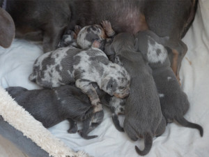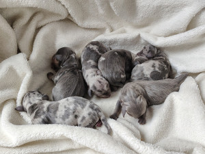 Dwa samce blue merle, trzy suczki blue merle i jedna suczka niebieska podpalana.