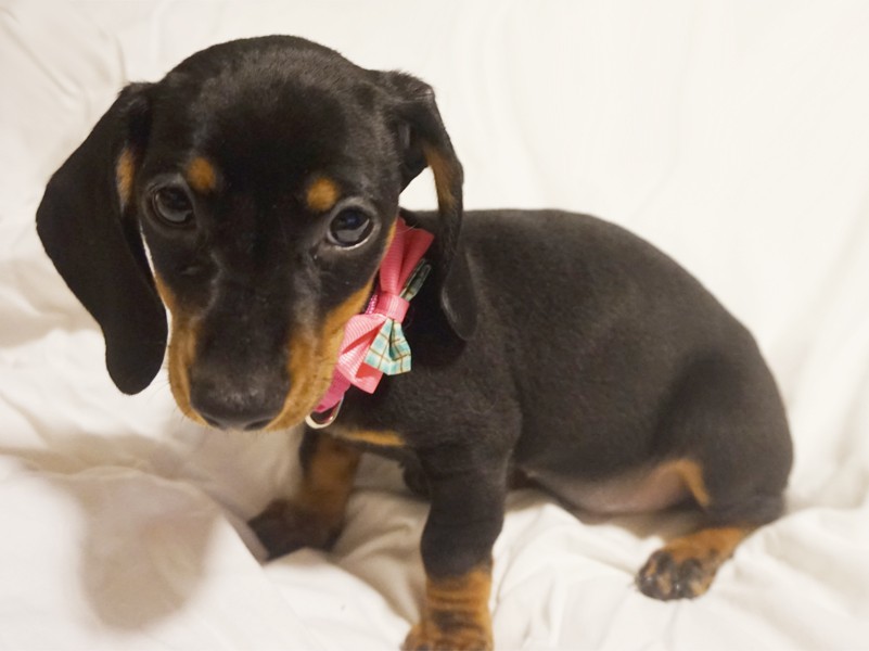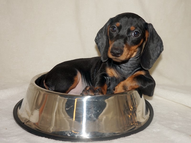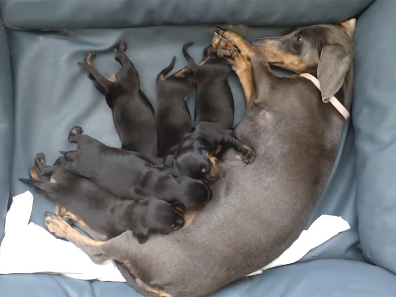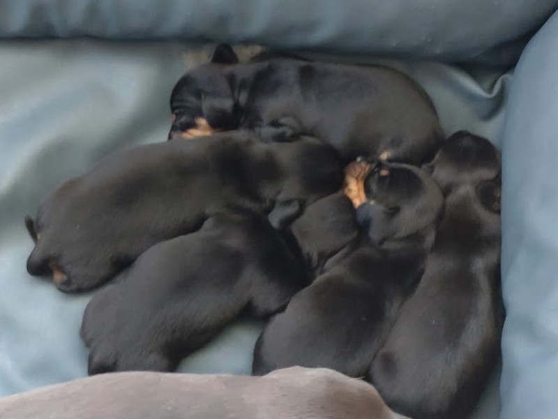 Pięć szczeniąt: cztery samce i jedna suczka. Szczenięta (wszystkie): Jamniki, krótkowłose, czarne podpalane, sądząc po wielkości rokują, że będą jamnikami miniaturowymi.