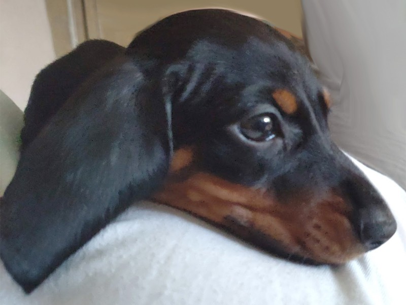 Dziewczynka - suczka, jamnik, czarny podpalany, przywitała nas o godzinie 20:08. (Znalazła nowy dom w Zawierciu.)