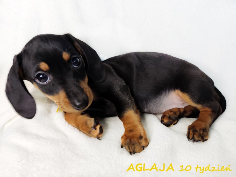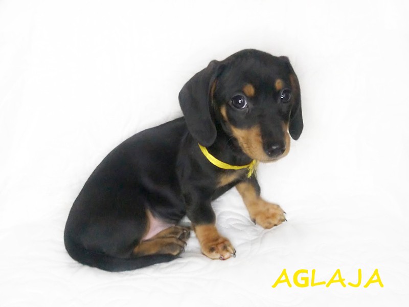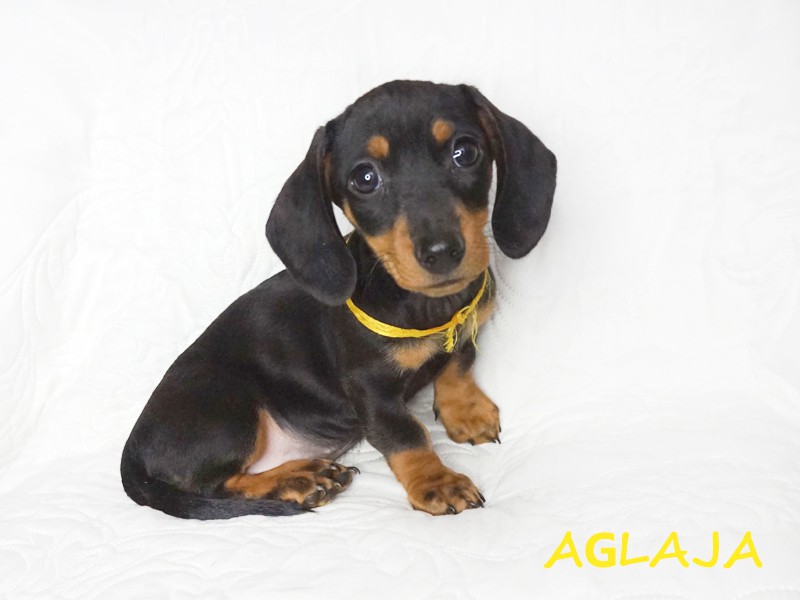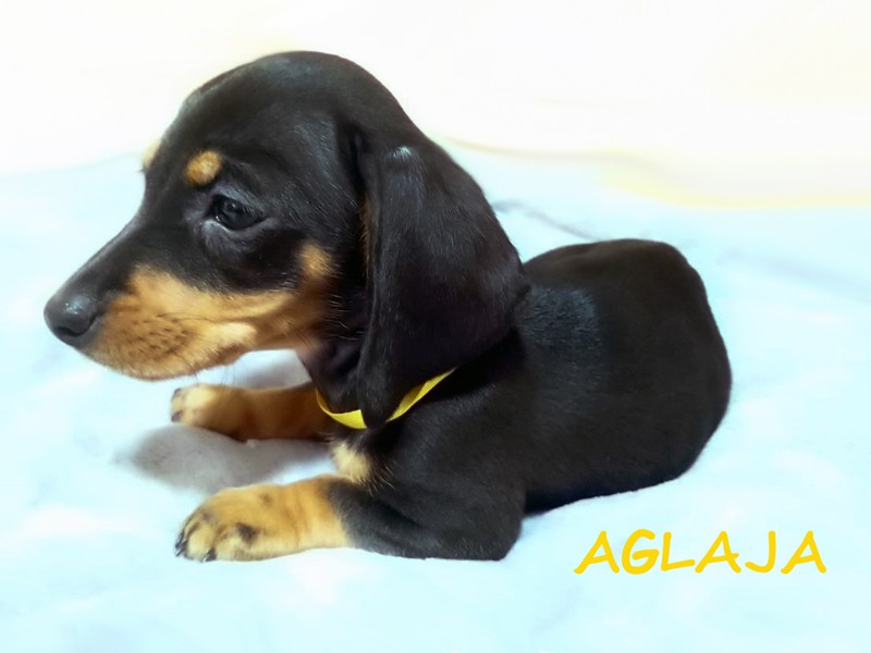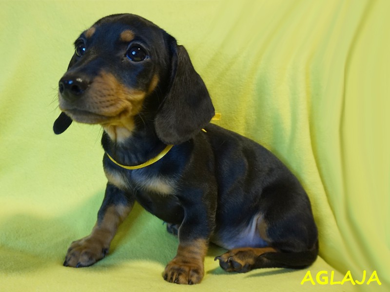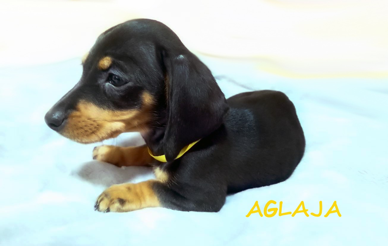 Urodziła się o godzinie 8:47. Piękna suczka Aglaja (imię oznacza "Promienna") pojawiła się w promykach słońca. :) Jamniczka czarna podpalana. (Znalazła nowy dom w okolicach Stargardu w woj. zachodniopomorskim.)