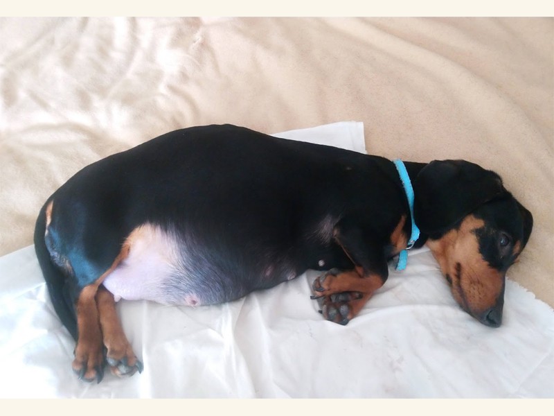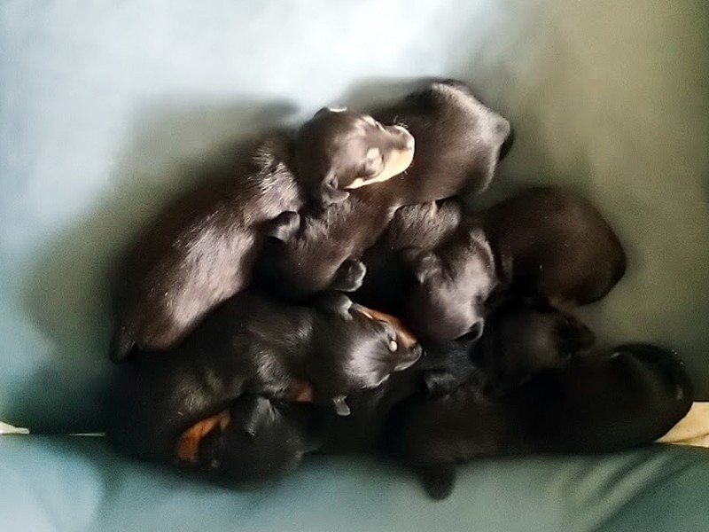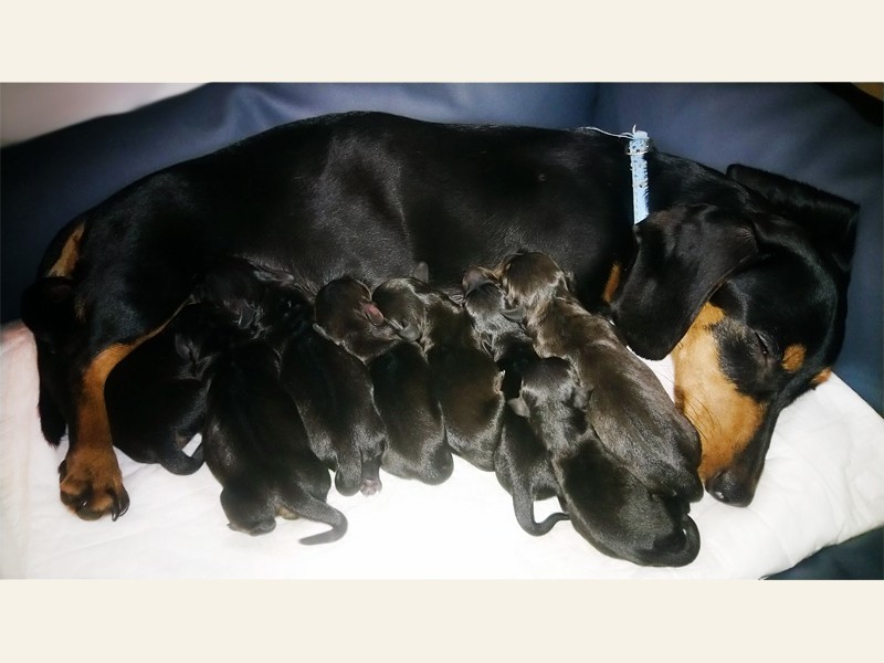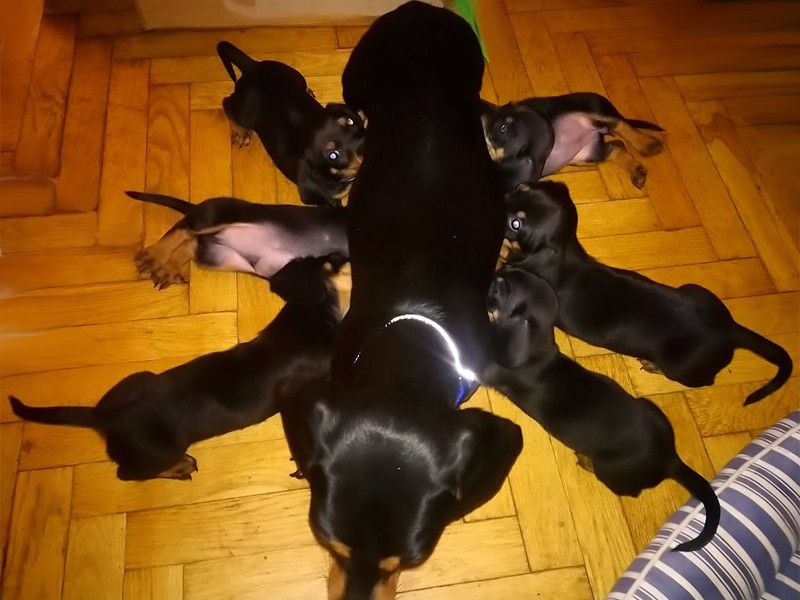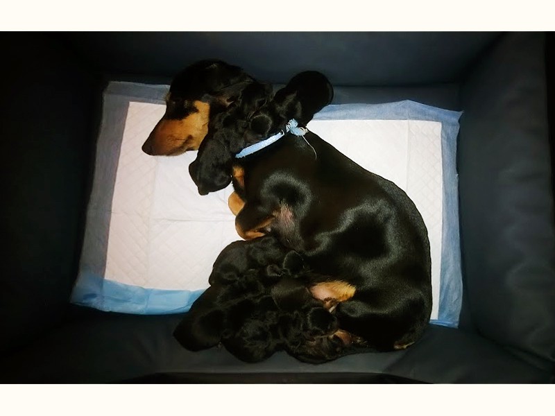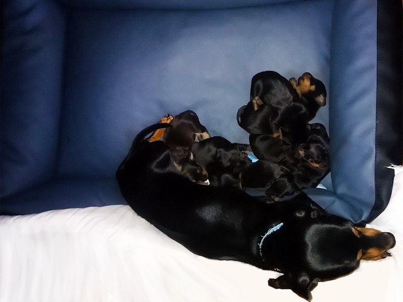 Mama urodziła siedem jamniczków bez problemów, siłami natury. (To jest pierwszy miot jamniczki Viktorii)