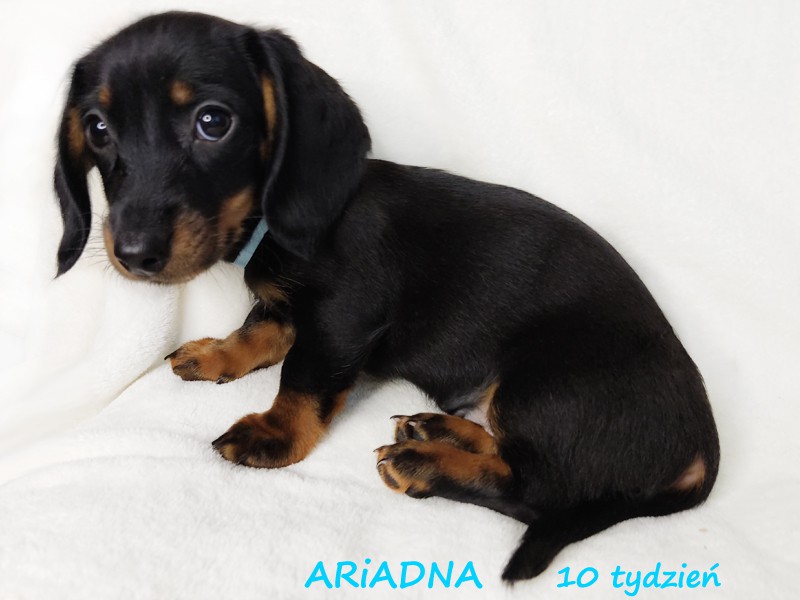 Przywitała nas o godzinie 9:43. Zwinna i sprytna mała suczka, której wszędzie pełno. "Nić Ariadny" oznacza pomoc w wyjściu z trudnej sytuacji. Ona sama radzi sobie ze wszystkimi przeszkodami. :) Jamniczka czarna podpalana. (Znalazła nowy dom w Szkocji, w Livingston).