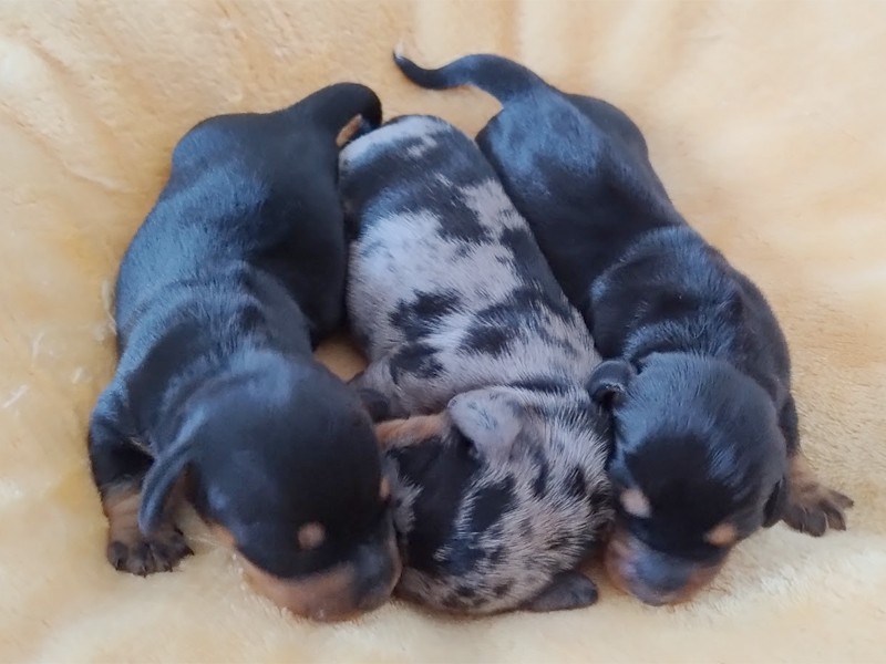 Jamniki, krótkowłose standardowe: trzy szczenięta.